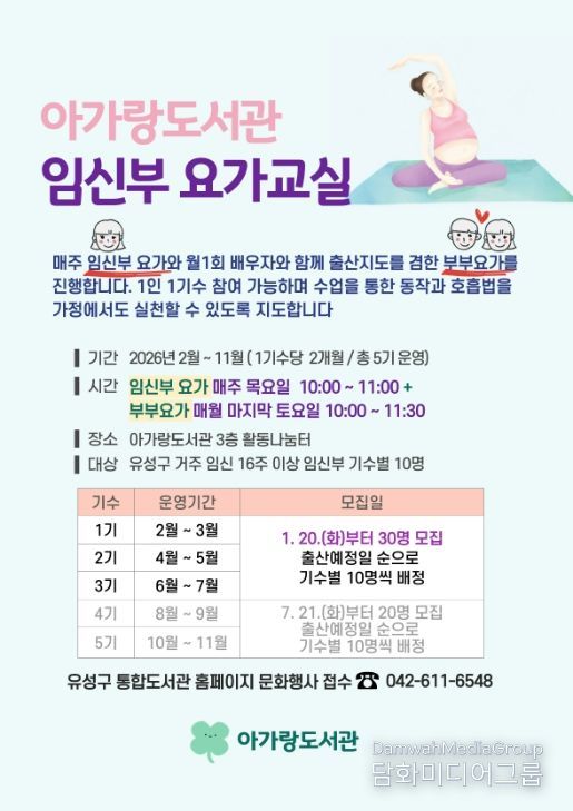 정용래 유성구청장은 “요가교실을 통해 임신부와 부부가 출산 과정을 함께 이해하고 준비하는 데 도움이 되길 바란다”라며 “앞으로도 임신·출산에 특화된 맞춤형 프로그램을 확대하겠다”라고 말했다.