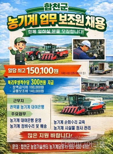 시민행정신문 강갑수 기자 | 합천군은 농기계대여은행 운영체계를 강화하고 농업인 영농 편의를 높이기 위해 2026년 농기계 업무보조원 기간제근로자 9명을 채용한다고 14일 밝혔다.