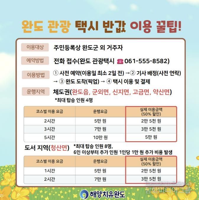 군 관계자는 “반값 관광 택시를 통해 이동의 불편함을 줄이고, 매력 있는 완도 관광지를 두루두루 둘러보시길 바란다”라고 말했다.