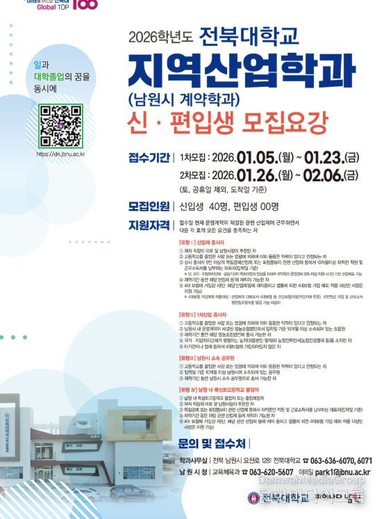 시민행정신문 강갑수 기자 | 남원시(시장 최경식)와 전북대학교는 지역 특화산업 전문인력 양성을 위해 2026학년도 전북대학교 지역산업학과(남원시 계약학과) 신·편입생을 모집한다고 밝혔다.