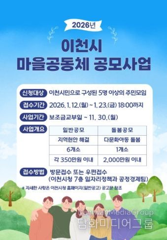 신청 기간은 1월 12일부터 1월 26일까지이며, 신청 방법과 제출서류 등 자세한 사항은 이천시 누리집 공고문을 통해 확인할 수 있다.