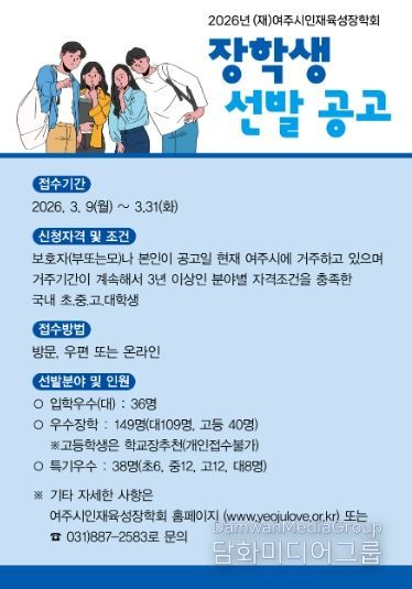 시민행정신문 강갑수 기자 | (재)여주시인재육성장학회는 ‘2026년 여주시인재육성장학회 장학생 선발공고’를 여주시인재육성장학회 홈페이지 및 여주시청 홈페이지에 게시했다