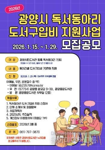 시민행정신문 강갑수 기자 | 광양시는 시민 독서문화 활성화를 위해'2026년 독서동아리 도서구입비 지원사업'에 참여할 독서동아리를 오는 1월 15일부터 1월 29일까지 모집한다.