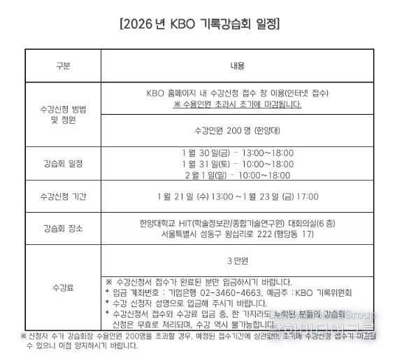 시민행정신문 장규호 기자 | 2026년 KBO 기록강습회가 1월 30일(금)부터 2월 1일(일)까지 서울 한양대학교에서 개최된다. 기록강습회는 야구 공식기록법의 보급과 이해를 통한 저변 확대를 목적으로 프로야구 원년인 1982년부터 개최됐다.