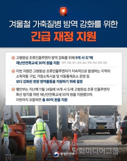 - 행안부는 지난해 11월 24일에 14개 시·도에 고병원성 조류인플루엔자 확산 방지를 위한 재난안전특교세 50억 원을 지원했으며 이번까지 포함하면 총 80억 원을 지원