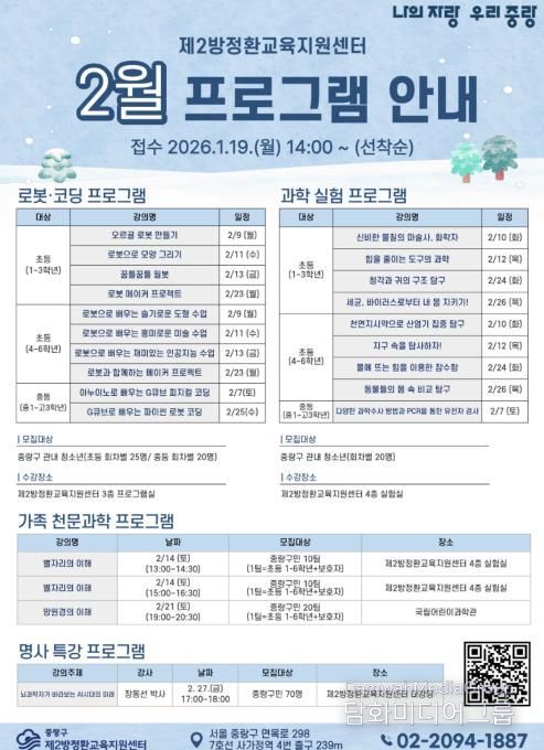 2월 겨울방학 특강은 로봇·코딩 프로그램과 과학 실험 프로그램을 중심으로 운영되며, 가족이 함께 참여하는 천문과학 프로그램을 포함해 구성됐다. 특히 천문과학 프로그램은 국립어린이과학관을 방문해 가족이 함께 전시와 체험 활동에 참여하는 방식으로 운영돼, 보다 생생한 과학 학습 경험을 제공할 예정이다. 2월 프로그램은 1월 19일부터 제2방정환교육지원센터 누리집을 통해 온라인 선착순 접수를 진행한다.