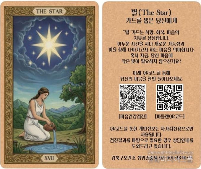 구는 관내 신한은행 금융 창구에 큐알코드(QR코드) 기반 타로카드 형태의 마음건강검진 시스템을 도입해 누구나 부담 없이 자신의 마음 상태를 점검할 수 있도록 했다. 비치된 타로카드 뒷면의 큐알코드를 통해 마음건강검진을 실시하고, 필요한 경우 상담을 받을 수 있다.