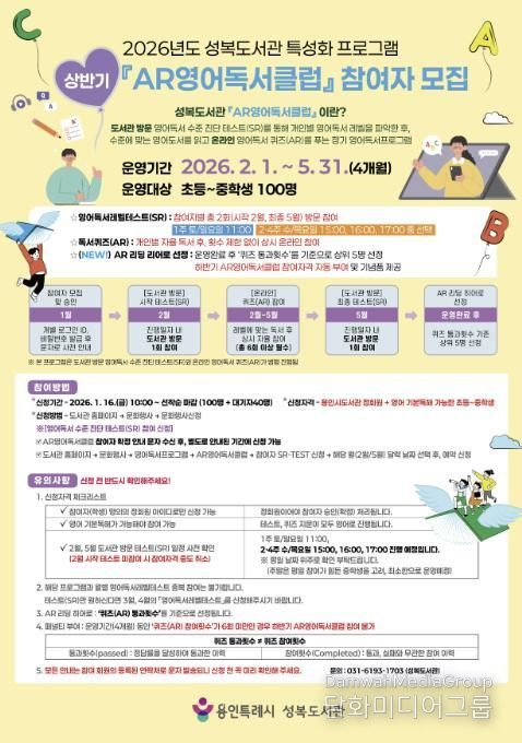 시민행정신문 강갑수 기자 | 용인특례시 성복도서관은 오는 16일부터 2026년 ‘AR(Accelerated Reader)영어독서클럽’ 상반기 참여자 100명을 모집한다고 15일 밝혔다.