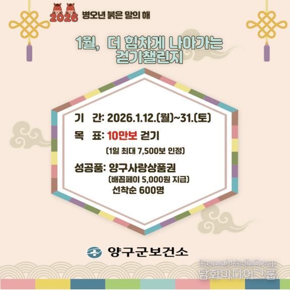 양구군은 1월부터 ‘워크온 걷기 챌린지’를 운영하며, 다양한 걷기 행사와 참여형 챌린지를 지속적으로 추진할 예정이다. 1월에는 목표 걸음 10만 보 이상, 2월부터 11월까지는 매달 목표 걸음 20만 보 이상을 걷는 주민에게 양구사랑상품권(배꼽페이) 5000원을 지급한다. 챌린지 기간 동안 하루 최대 7500보까지 인정되며 선착순 600명에게 지급한다.