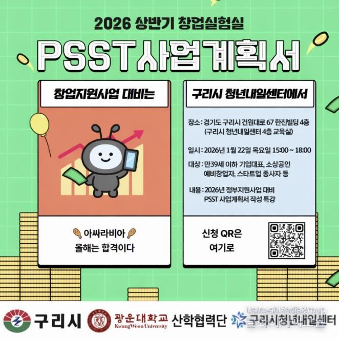 이번 프로그램은 2026년 대형 정부 창업지원 사업을 대비한 PSST 전략 사업계획서 작성 특강으로, 실질적인 창업 역량 강화를 목표로 기획됐다. 특강은 1월 22일(목) 오후 3시부터 6시까지 운영되며, 관내 청년 예비창업가와 기업 대표, 소상공인 등을 대상으로 사업계획서 작성 비법과 맞춤형 조언을 중심으로 한 실전형 교육으로 진행될 예정이다.