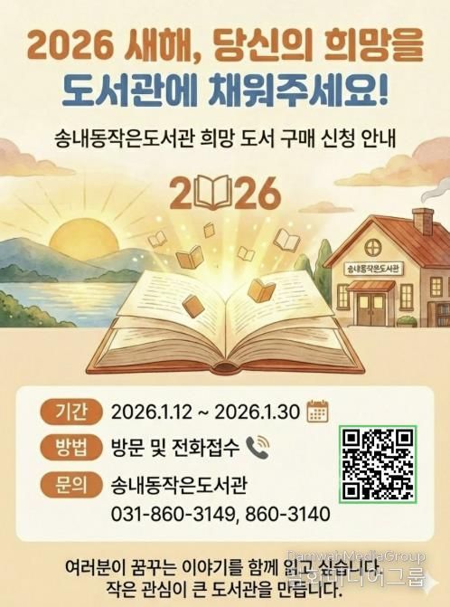 희망도서 접수 기간은 2026년 1월 12일부터 1월 30일까지이며, 송내동 주민이라면 누구나 신청할 수 있다. 접수된 도서는 적합성 등 소정의 선정 절차를 거쳐 작은도서관의 정식 장서로 비치될 예정이다.