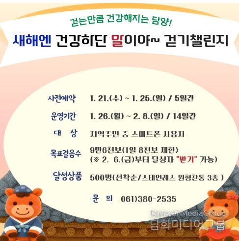 시민행정신문 강갑수 기자 | 담양군은 2026년 새해를 맞아 오는 1월 26일부터 2월 8일까지 온라인 걷기 챌린지 ‘새해엔 건강하단 말이야’를 운영한다고 밝혔다.