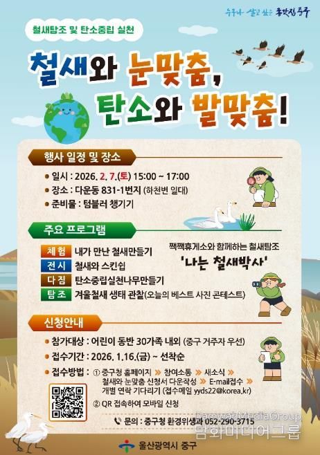 시민행정신문 강갑수 기자 | 울산 중구가 겨울방학을 맞아 온 가족을 위한 ‘철새와 눈맞춤, 탄소와 발맞춤’ 생태 체험 행사를 진행한다.