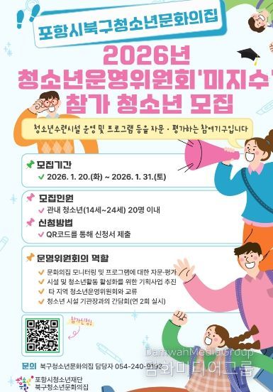 시민행정신문 강갑수 기자 | 포항시청소년재단 북구청소년문화의집은 오는 20일부터 31일까지 청소년운영위원회 ‘미지수’ 참가 청소년을 모집한다.