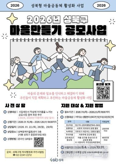 시민행정신문 강갑수 기자 | 서울시 성북구는 마을공동체 활성화를 위해 '2026년 성북구 마을만들기 공모사업'을 진행한다.