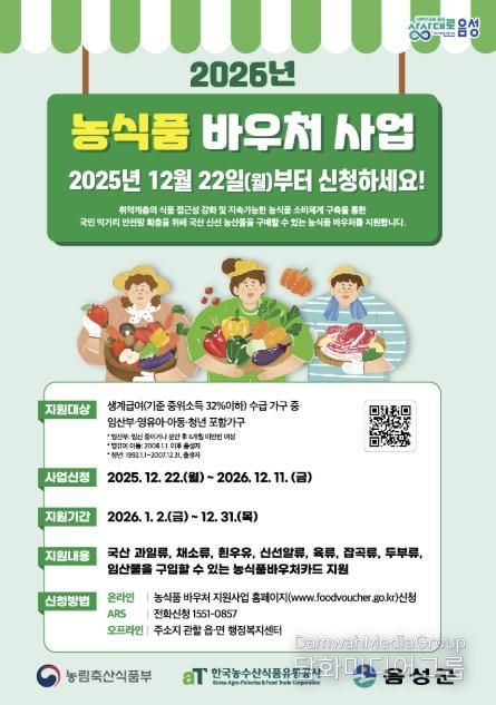 시민행정신문 강갑수 기자 | 음성군은 취약계층이 신선 농산물을 구매할 수 있는 카드를 지원하는 ‘2026년 농식품 바우처 사업’의 신청을 받고 있다.