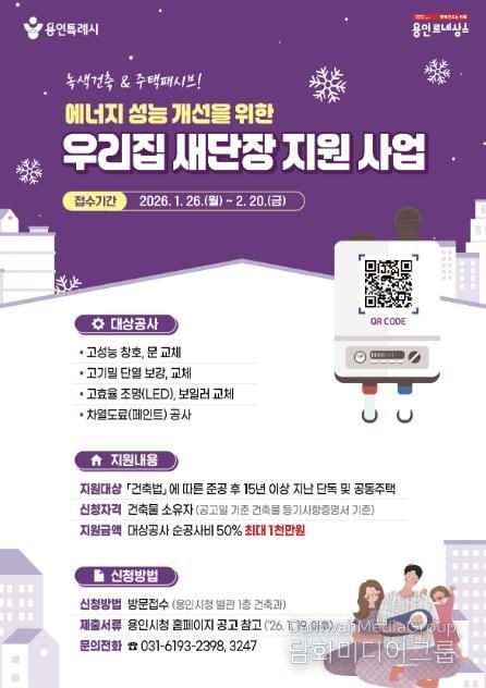 시민행정신문 강갑수 기자 | 용인특례시가 오는 26일부터 2월 20일까지 노후주택 에너지 효율 개선 지원 사업인 ‘우리집 새단장 지원사업’ 신청을 받는다고 16일 밝혔다.