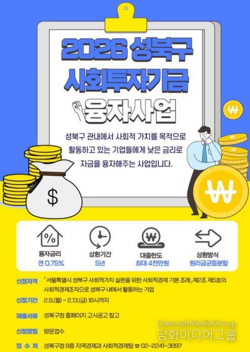 시민행정신문 강갑수 기자 | 서울 성북구가 ‘2026년 상반기 사회투자기금 융자 지원 사업’을 실시한다. 경제적 어려움을 겪는 관내 사회적경제 조직의 안정적인 운영을 돕기 위해서다.