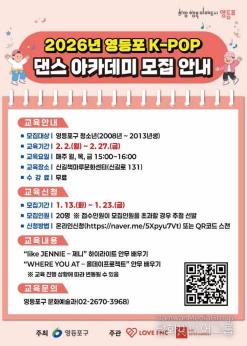 시민행정신문 강갑수 기자 | 영등포구가 지역 청소년들이 K-POP 문화를 직접 체험하며 자신감을 키우고 예술적 재능을 마음껏 펼칠 수 있도록 ‘영등포 K-POP 댄스 아카데미’ 를 운영한다고 밝혔다.