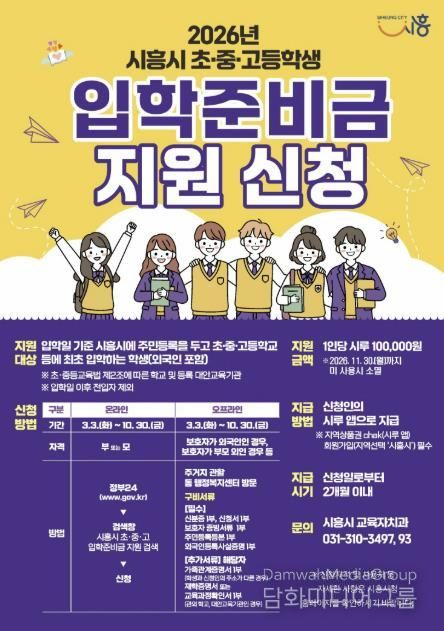 시민행정신문 이세훈 기자 | 시흥시는 올해부터 관내 초중고 입학 자녀 가정에 입학준비금을 10만 원씩 지원한다. 이번 지원은 도서나 문구류 등을 새로 마련해야 하는 신입생 가정의 경제적 부담을 줄여주고, 교육 기본권을 강화하고자 추진됐다.