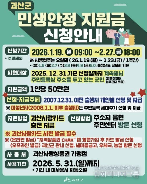 민생안정지원금은 2025년 12월 31일 기준일부터 현재까지 괴산군에 주민등록이 돼 있는 군민을 대상으로 1인당 50만 원을 지급하는 정책으로 신청은 주소지 읍·면사무소를 방문해 신청하면 된다.