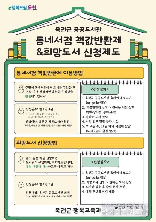 이와 함께 운영 중인 ‘희망도서 신청제도’는 군민이 읽고 싶은 도서를 옥천군 공공도서관 홈페이지를 통해 신청하면, 선정 절차를 거쳐 분기별로 비치되는 제도이다.