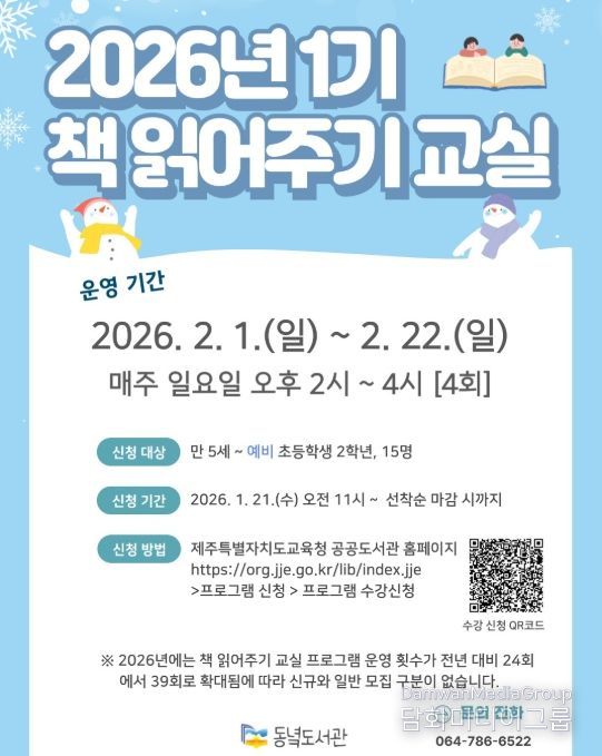 시민행정신문 기자 | 제주도교육청 동녘도서관은 2월 1일부터 22일까지 평생교육실에서 유아 및 저학년 어린이의 독서 흥미와 창의력 향상을 위한 ‘2026년 1기 책 읽어주기 교실’을 운영한다.