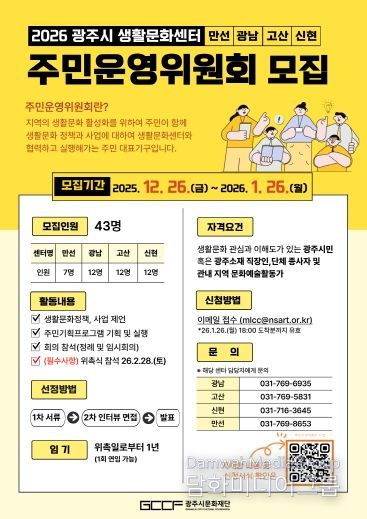 시민행정신문 기자 | (재)광주시문화재단은 광주시 생활문화센터(만선·광남·고산·신현)에서 2026년에 활동할 주민운영위원회 위원을 통합 공개 모집한다고 밝혔다.
