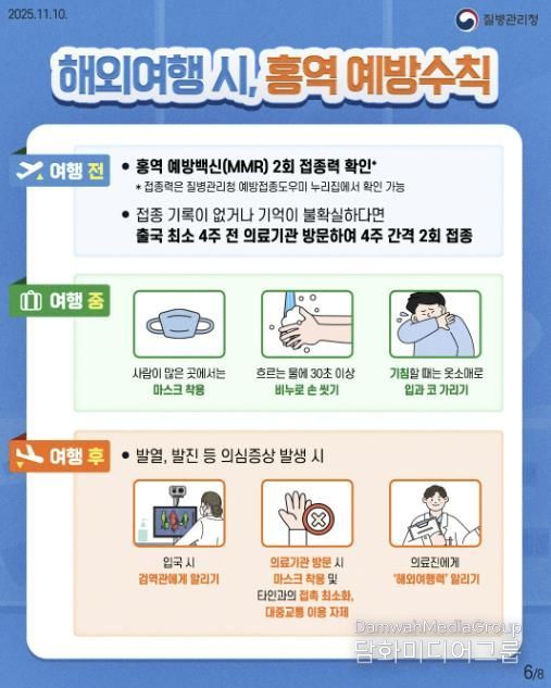 해외여행을 계획 중이라면 질병관리청 ‘해외감염병 나우(NOW)’누리집 또는 콜센터(1339)를 통해 여행 국가의 감염병 발생 정보를 확인하고, 특히, 홍역 발생이 많은 국가를 방문하는 경우 출국 최소 4주 전 예방접종을 완료하는 것이 바람직하다.