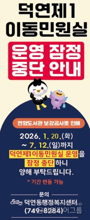 시민행정신문 강갑수 기자 | 순천시 덕연동행정복지센터는 연향도서관 내에 운영 중인 덕연동 제1이동민원실이 도서관 내진성능 보강공사 시행에 따라 오는 1월 20일부터 7월 12일까지 운영을 잠정 중단한다고 밝혔다.