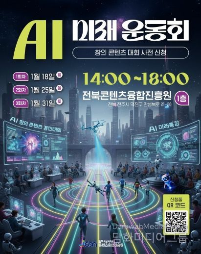 시민행정신문 이세훈 기자 | 전북특별자치도가 주최하고 전북특별자치도콘텐츠융합진흥원이 주관하는‘AI 미래운동회 & 창의 콘텐츠 대회’가 오는 1월 18일, 25일, 31일 총 3회에 걸쳐 걸쳐 진흥원 1층에서 개최된다