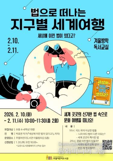겨울방학 독서교실은 각 주제별로 2회씩 운영된다. ‘환경’을 주제로 한 초등 3~4학년 대상 프로그램은 1월 27일(화), 1월 28일(수) 오전 10시에 진행되며, ‘법’을 주제로 한 초등 4~6학년 대상 프로그램은 2월 10일(화), 2월 11일(수) 오전 10시에 진행된다.