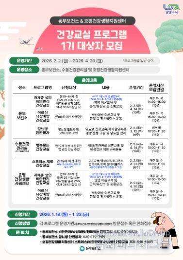 시민행정신문 기자 | 남양주시는 오는 1월 19일부터 23일까지 호평건강지원센터에서 ‘건강교실 프로그램’ 1기 참여자를 모집한다고 밝혔다.