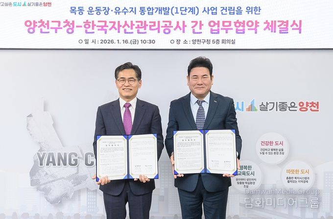 시민행정신문 강갑수 기자 | 양천구가 1월 16일 한국자산관리공사와 업무협약을 체결하며, 목동운동장·유수지 일대 통합개발(목동MICE)을 위한 첫걸음을 내디뎠다.