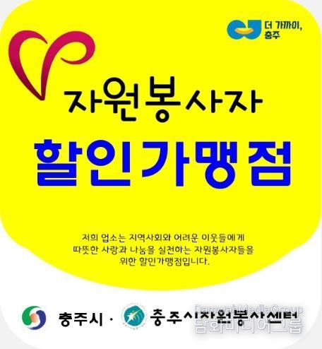 시민행정신문 강갑수 기자 | 충주시자원봉사센터는 지역사회 나눔 활성화를 위해 지역 업체와 협약을 맺고, 자원봉사자에게 할인 혜택을 제공하기 위해 자원봉사자 할인가맹점을 연중 상시 모집하고 있다.