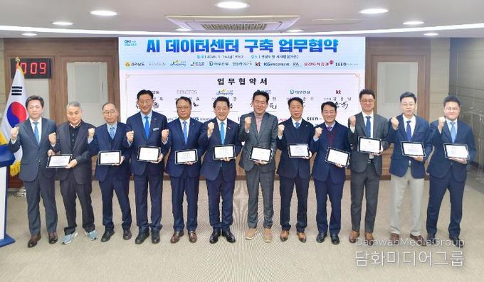 군은 16일 전남도청에서 전라남도, ㈜베네포스, 케이티(KT), 대우건설, 탑솔라, 아이피에이(IPA), 케이지(KG)엔지니어링, 유진투자증권, 시드인베스트먼트 자산운용과 함께 ‘AI 데이터센터’ 구축 업무협약을 체결했다.