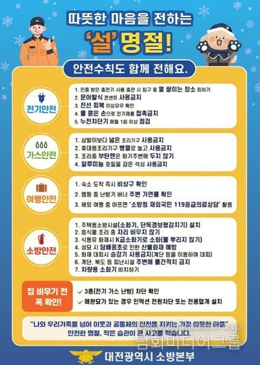 김문용 대전소방본부장은 “설 명절 전후는 화재 위험이 높은 시기인 만큼, 시민 여러분의 적극적인 관심과 실천이 무엇보다 중요하다”라며 “모두가 안전한 설 연휴를 보낼 수 있도록 화재 예방에 동참해 주시기 바란다”라고 말했다.