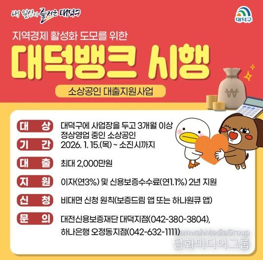 시민행정신문 이세훈 기자 | 대전 대덕구는 경기침체로 자금 운용에 어려움을 겪는 지역 소상공인의 금융 부담을 완화하기 위해 소상공인 대출지원사업 ‘2026 대덕뱅크’를 시행한다.