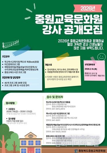 시민행정신문 기자 | 충청북도교육청 직속기관 중원교육문화원은 23일까지 학생과 학부모, 지역주민을 대상으로 운영하는 2026년도 인문독서 및 문화예술 프로그램 강사를 공개 모집한다고 밝혔다.