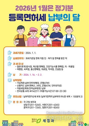 시민행정신문 강갑수 기자 | 청주시는 2026년 1월 정기분 등록면허세(면허) 12만1천337건에 대해 총 32억원을 부과했다고 18일 밝혔다. 이는 전년 대비 3천352건, 1억원이 증가한 규모다.