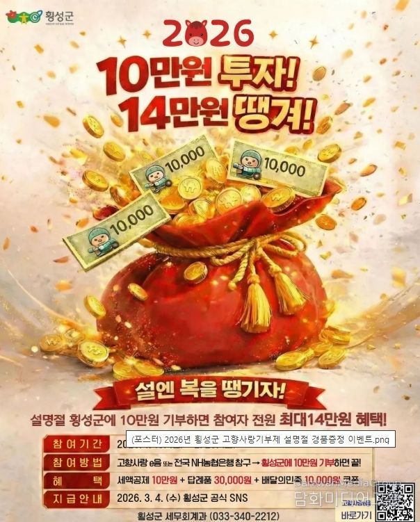 조정옥 세무회계과장은 “민족 대명절인 설을 맞아 횡성을 응원해 주시는 분들께 더 큰 혜택을 드리고자 이번 행사를 기획했다”며, “고향 사랑을 실천하고 세액공제와 경품 혜택까지 모두 챙기시길 바란다”고 전했다.