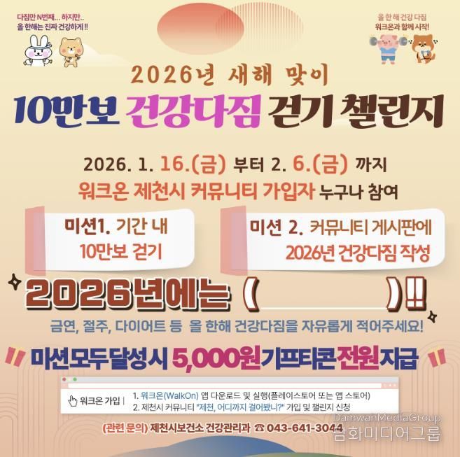 제천시보건소 관계자는 “2026년 새해를 맞아 건강다짐과 걷기 실천을 함께 할 수 있도록 마련한 챌린지”라며 “올 한 해에도 보건소와 함께 걷기를 실천하며 건강 다짐을 완성할 수 있기를 바란다.”고 말했다.