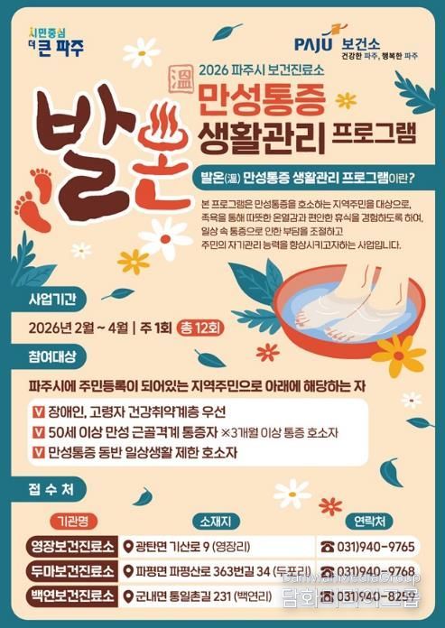 시민행정신문 기자 | 파주시 보건진료소는 보건의료 취약지역 주민들의 건강증진을 위해 2026년 ‘발온(溫) 만성통증 생활관리’교실을 운영한다.