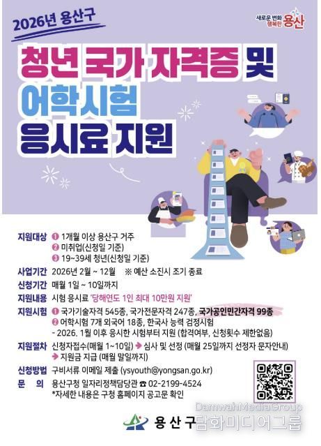 시민행정신문 강갑수 기자 | 서울 용산구가 올해 ‘청년 국가자격증 및 어학시험 응시료 지원 사업’ 예산과 지원 종목을 대폭 확대해 시행한다. 기존 대비 지원대상을 100여 명 늘리고, 국가공인민간자격 99종을 새롭게 추가했다.