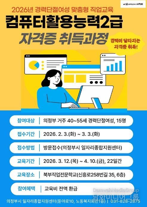 시민행정신문 강갑수 기자 | 의정부시는 경력단절여성의 취업역량 강화를 위해 2월 3일부터 3월 3일까지 ‘컴퓨터활용능력2급 자격증 취득과정’ 참여자를 모집한다.