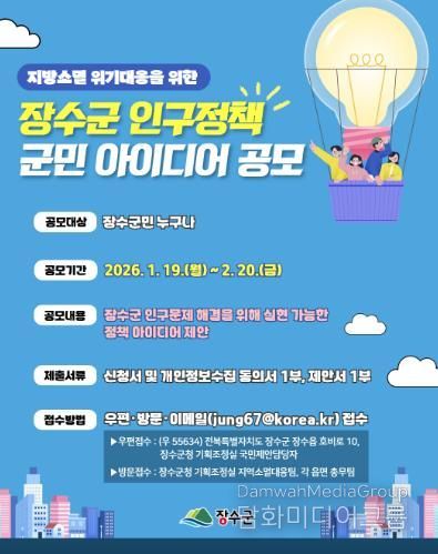 시민행정신문 강갑수 기자 | 장수군은 인구감소 문제에 능동적으로 대응하고 지역 여건에 맞는 실효성 있는 정책을 발굴하기 위해 ‘인구정책 군민 아이디어 공모’를 19일부터 추진한다고 밝혔다.