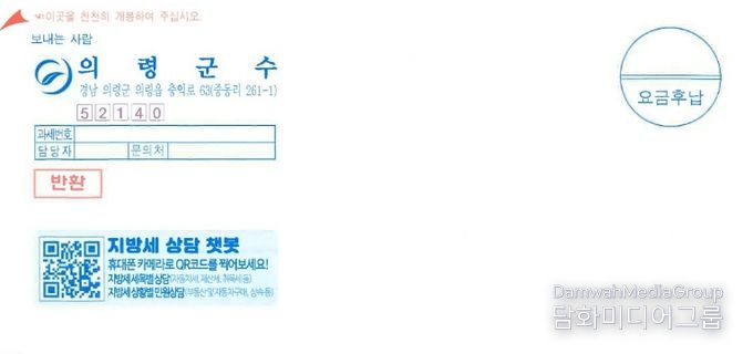 시민행정신문 강갑수 기자 | 의령군은 지방세 고지서 전면에 ‘지방세 챗봇 상담서비스’ QR코드를 삽입해 발송한다고 밝혔다.