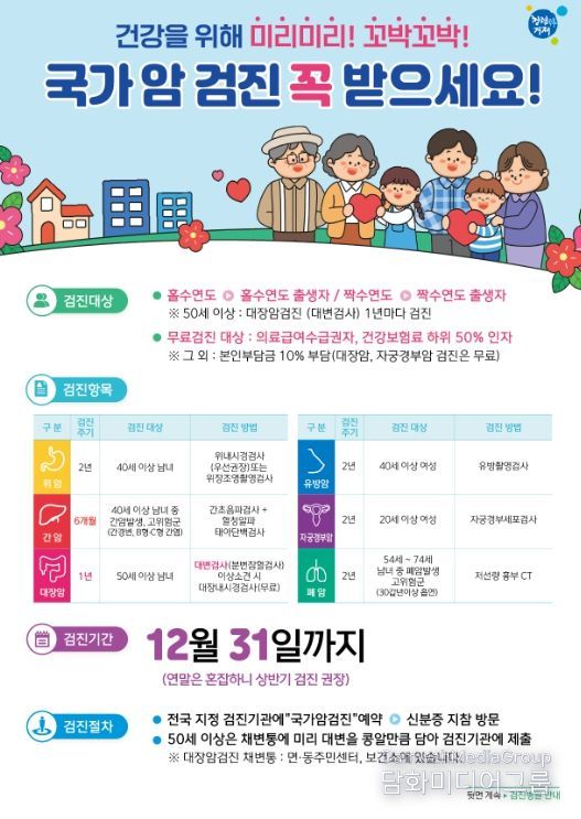 건강증진과 강미정 과장은 “연말에는 검진자가 집중되어 대기 시간이 길어질 수 있으므로, 연초부터 상반기 중 여유 있게 검진을 받길 바란다”고 전했다.