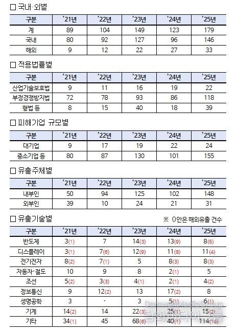유출 기술별로는 ▵기계(15건, 8.3%) ▵디스플레이(11건, 6.1%) ▵반도체(8건, 4.5%) ▵정보통신(8건, 4.5%) ▵이차전지(8건, 4.5%) ▵생명공학(6건, 3.4%) ▵자동차·철도(5건, 2.8%) 등 순으로 나타났다.