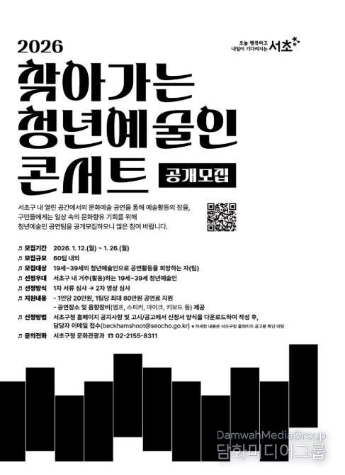 시민행정신문 강갑수 기자 | 서울 서초구는 지역 내 일상 공간에서 자유롭게 끼와 역량을 펼칠 청년예술인 모집에 나선다고 밝혔다. 모집사업은 ‘찾아가는 청년예술인 콘서트’와 ‘서초 청년갤러리 사업’으로 각각 1월 26일(월), 2월 19일(목)까지 신청을 받는다.